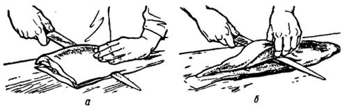 Рис. 8. Пластування риби: а — від голови до хвоста; б — від хвоста до голови.