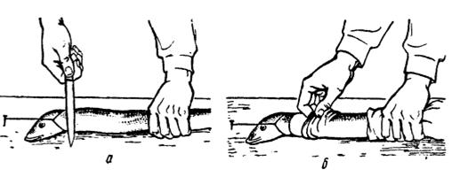 Рис. 11. Знімання шкіри з вугра: а — надрізування шкіри навколо голови; б — знімання шкіри “панчохою”.