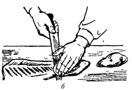 Рис. 22. Нарізування риби: а — під прямим кутом; б — під кутом 30.