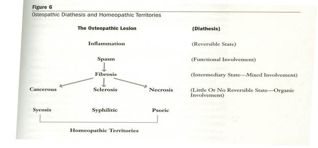 Малигнизация или стадия некроза не являются процессом рубцевания, хотя тут идет поражение ткани. Болезненная предрасположенность подобных тканей вовлекает в гиперпродукцию и дезорганизацию (малигнизация), или тканевую смерть (некроз). Здесь мы находим представление, понятие, которое дорого для гомеопата. Мы можем увидеть интересную параллель между диатезом остеопатического поражения и гомеопатической зоной.