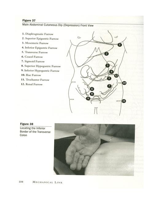 Висцеральные массы не гомогеничны, и не одноформенны; контуры поверхностной фасции близко соотносятся и к глубокой фасции. Мы, однако, можем локализовать орган путем его париетальной топографии. Скользя руками поверхностно и следуя соответствующим анатомическим ориентирам, с разумеющейся ориентацией, мы будем находить подлежащий орган, его формы и позицию. Мы не только можем определять границы висцеральной структуры, следуя контурам ткани, но также мы используем эти висцеро-кожные углубления как прямой доступ к исследуемым органам.