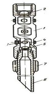1 — корпус; 2 — шар опрессовочного клапана; 3 — узел насадки; 4 — заглушка; 5 — шар клапана; 6 — хвостовик; 7 — центратор