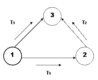Краткая теоретическая справка.В данной лабораторной работе исследуется 3-узловая сеть с коммутацией каналов. Примерами реальных сетей, к которым применима рассматриваемая модель, являются сети с виртуальными каналами, такие как Х.25 или Frame Relay. В каждой ветви количество пучков в канале n = 1. Узел 1 является источником трафика, узел 3 – получателем. Путь 1-3 считается прямым, 1-2-3 – обходным путем. Для каждой из ветвей заданы значения интервалов между заявками, причем для ветвей 1-2 и 2-3 эти значения фиксированные (табл. 1.1), а интервал между заявками в 3-й ветви Т3 изменяется в процессе исследования.