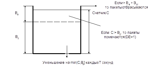 В алгоритме предполагается, что трафик контролируется каждые Т секунд. На каждом из этих интервалов времени (периодов) трафик должен иметь среднюю скорость не более CIR. Скорость контролируется на основе подсчета объема данных, поступивших за период Т. Если этот объем меньше или равен Вс, то фактическая скорость трафика была меньше Вс/Т, т. е. меньше CIR. Превышение объемом пульсации оговоренного значения Вс на величину Ве считается мягким нарушением – пакеты-нарушители должны быть помечены (окрашены) признаком DE=1 (Discard Eligibility), но не отброшены. При превышении объема пульсации величины Вс + Bе пакеты отбрасываются (рис. 4.2).