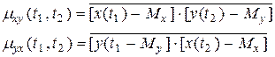 Случайные процессы называются стационарно связанными, если их ВКФ зависят не от самих аргументов, а лишь от величины их разности t = t2 - t1. В этом случае mxy(t) = myx(-t).