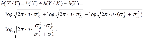 Здесь h(X) и h(Y) - дифференциальные энтропии процессов X(t) и Y(t), определяемые в соответствии с (2.27), а h(X/Y) - условная дифференциальная энтропия отсчета X(t) при известном отсчете Y(t) и h(Y/X) - условная дифференциальная энтропия отсчета Y(t) при известном отсчете X(t). Приведенные в (2.28) дифференциальные энтропии имеют тот же смысл, что и в (2.17), т.е., например, h(Y/X) представляет собой дифференциальную энтропию шума в канале на один отсчет помехи. Условная дифференциальная энтропия h(X/Y) может быть найдена из выражения