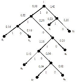 Для наглядного представления этого процесса удобнее всего построить граф, называемый кодовым деревом. Процедура построения кодового дерева выглядит следующим образом. Из вершины, соответствующей последнему единственному вспомогательному символу с вероятностью, равной 1, направляются две ветви, причем ветви с большей вероятностью присваивается кодовый символ 1, а с меньшей - 0. Такое последовательное ветвление из вершин, соответствующих вспомогательным символам, продолжается до получения вершин, соответствующих основным исходным символам.