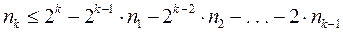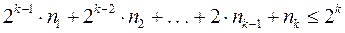 При использовании префиксных кодов возникает вопрос о том, каковы возможные длины кодовых комбинаций префиксного кода. Пусть a1, a2, . . . , aN - кодовые комбинации префиксного двоичного кода. Пусть nk -число кодовых комбинаций длины k . Число nk совпадает с числом вершин k-го уровня кодового дерева. Конечно справедливо неравенство nk £ 2k, поскольку 2k - максимально возможное число вершин на k-м уровне двоичного дерева. Однако для префиксного кода можно получить гораздо более точную оценку. Если n1, n2, . . . , nk-1 - число вершин 1-го, 2-го, . . . , (k-1)-го уровней дерева, то число всех вершин k-го уровня кодового дерева префиксного кода равно