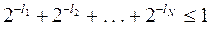 Это и есть условие, которому должны удовлетворять длины кодовых комбинаций двоичного префиксного кода. Это неравенство в теории кодирования называется неравенством Крафта и является достаточным условием того, что существует префиксный код с длинами кодовых комбинаций l1, l2, . . . , lN .