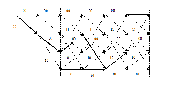 Для упрощения демонстрации работы алгоритма Витерби положим, что передавалась нулевая последовательность 00000000. . . , а принятой оказалась последовательность с одной ошибкой 10000000. . . .