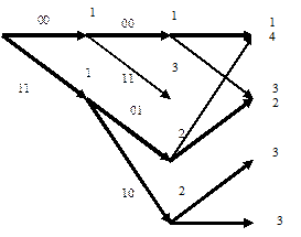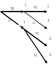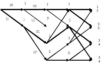 Декодер выберет оба пути и определит метрику каждого из них – цифра над узлом.