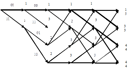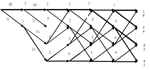 Продемонстрируем процесс кодирования с помощью решетчатого графа, например, кодируя входную комбинацию =101100 . . ., т.е. выходная комбинация, найденная по графу (жирные линии) будет 1101001010, что можно проверить, воспользовавшись построенной ранее образующей матрицей и сложив по модулю два 1, 3 и 4 ее строки