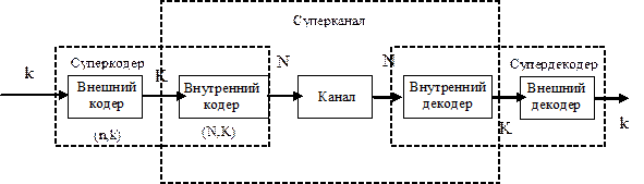 Совокупность внутреннего кодера, канала и внутреннего декодера называется суперканалом. Совокупность внешнего и внутреннего кодеров называется суперкодером, а соответствующая совокупность на приемной стороне – супердекодером. Длина кодовой комбинации каскадного кода N*=nN, количество информационных символов в ней K*=kK, а скорость кода определяется по известной формуле