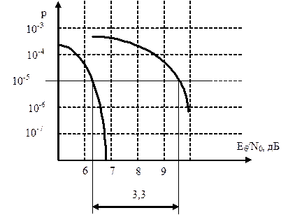 Обычный метод определения выигрыша от кодирования состоит в сравнении графиков pб =f(Eб/N0) для систем без кодирования и с кодированием и определении разности значений Eб/N0 при данной вероятности ошибки