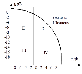 Например, пусть заданы скорость передачи R, полоса частот канала F и отношение сигнал-шум Q. Тогда область возможных значений b и g можно разбить на четыре квадранта. Системы, расположенные в I квадранте, удовлетворяют требованиям по обоим показателям b >b* и g > g *. Системы, расположенные в квадранте II, удовлетворяют требованиям только по b, а системы квадранта IV удовлетворяют требованиям только по g -эффективности. Системы квадранта III не удовлетворяют требованиям по обоим показателям.