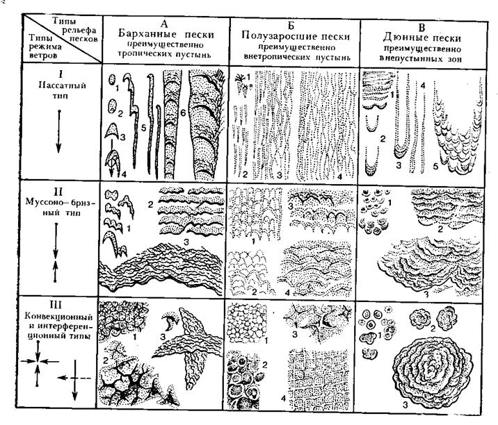 /. Пассатный тип ветра — 1 — песчаный щит, 2 — эмбриональный бархан, 3 — серповидный симметричный бархан, 4 — несимметричный бархан, 5 — продольные ветру барханные гряды, 6 — комплексные продольные барханные гряды; II. Муссоно-бризовый тип ветра — 1 — групповые барханы, 2-г простые барханные цепи, 3 — комплексные барханные цепи; III. Конвекционный и интерференционный типы ветров и ветры поперечных направлении — 1 — цирковые барханы, 2 — пирамидальные барханы, 3 — скрещенные комплексные барханы. Б. Полузаросшие пески: