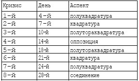 При острых заболеваниях опасность всегда наступает на 7, 14, 21 день. Эти дни называются «критическими днями», потому что в эти дни Луна образует неблагоприятные аспекты со своим положением в Гороскопе Декумбитуры. На время месячного лунного периода приходится не больше 8 критических дат, точное наступление которых немного меняется в зависимости от скорости Луны. В критические дни транзитная Луна образует следующие аспекты с её положением на день начала заболевания.