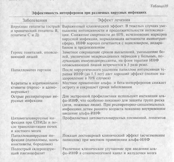 Со времени появления ИНФ стали вызывать большой интерес с точки зрения как профилактики, так и лечения вирусных заболеваний. Результаты исследований показали, что ИНФ эффективны для лечения вирусных гепатитов, герпеса, острых респираторных инфекций, ВИЧ-инфекции и некоторых других заболеваний (табл. 10).