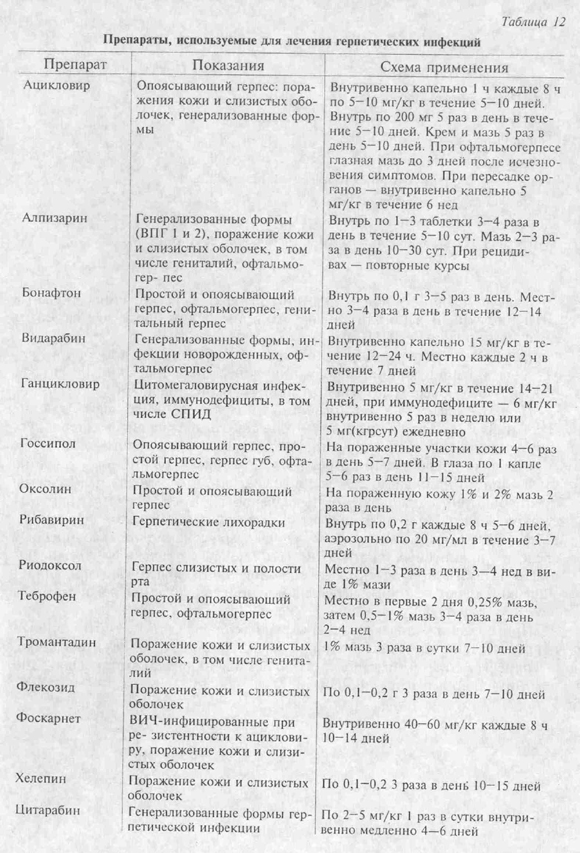 Герпетические инфекции. Заболевание, вызванное герпетическими вирусами, широко распространено как в России, так и в странах СНГ. Герпетическая вирусная инфекция относится к так называемым пожизненным оппортунистическим инфекциям и поэтому представляет собой серьезную клиническую проблему, особенно у людей с приобретенным иммунодефицитом, в частности ВИЧ-инфекции. Многочисленные препараты, применяемые при лечении герпесвирусных заболеваний, представлены в табл 12.