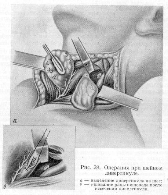 Консервативное лечение заключается в щадящей диете, дробном питании, приподнятом положении головы. Перед едой целесообразно принять1-2 чайные ложки растительного масла, а после еды прополоскать рот минеральной водой. Если указанные мероприятия не дают эффекта и возникают осложнения, то показано оперативное лечение. Хирургическое лечение заключается в резекции дивертикула с последующей пластикой пищевода (рис. 4).