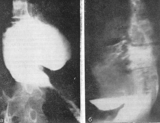 Рис. 7. Рентгенограмма. Приобретенный эпифренальный дивертикул и симптоматическая ахалазия кардии. А – передняя; б – боковая проекция.