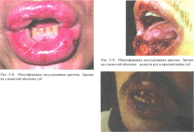 | Многоформная | На красной кайме губ на | Многоформная экссудативная эритема токсико-ал- |
