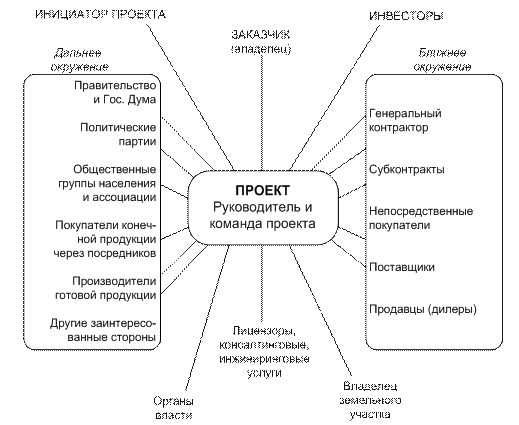 Основные участники проекта. Реализация замысла проекта обеспечивается участниками проекта. В зависимости от вида проекта в его реализации могут принимать участие от одной до нескольких десятков (иногда сотен) организаций. У каждой из них свои функции, степень участия в проекте и мера ответственности за его судьбу. Вместе с тем все эти организации в зависимости от выполняемых ими функций принято объединять в конкретные группы (категории) участников проекта. Схематическое изображение основных участников проекта приведено на рис. 1.3.