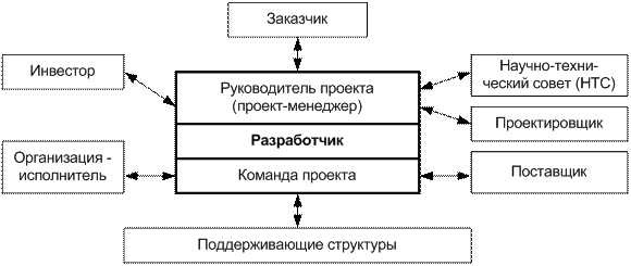Руководитель проекта (в принятой на Западе терминологии «проект-ме-неджер») – юридическое лицо, которому заказчик делегирует полномочия по руководству работами по проекту: планированию, контролю и координации работ участников проекта. Конкретный состав полномочий руководителя проекта определяется контрактом с заказчиком. Команда проекта – специфическая организационная структура, возглавляемая руководителем проекта и создаваемая на период осуществления проекта с целью эффективного достижения его целей. Состав и функции команды проекта зависят от масштабов, сложности и других характеристик проекта. Команда проекта вместе с руководителем проекта является разработчиком проекта. Для выполнения части своих функций разработчик может привлекать специализированные организации.