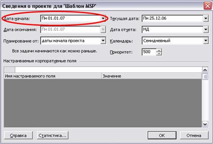 2. Ввести предполагаемую дату начала проекта: меню Проект/ Сведения о проекте…/ поле «Дата начала:» (рис. 5.1).