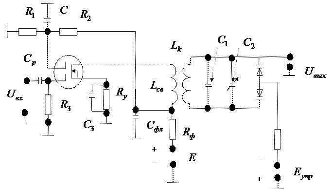 Транзистор связан с контуром через трансформаторную связь. Второй затвор полевого транзистора может быть использован для подачи напряжения автоматической регулировки усиления.