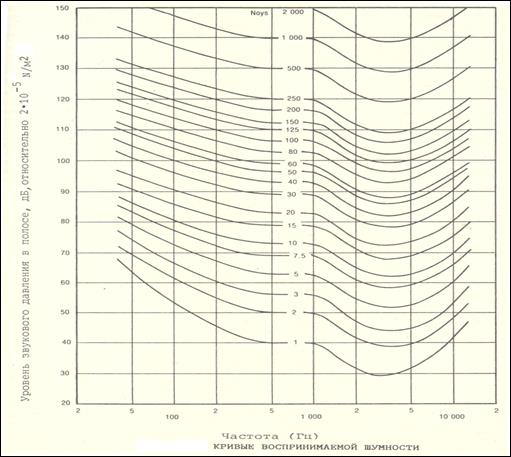 При измерении авиационного шума получают для каждого полусекундного приращения времени мгновенный уровень звукового давления в каждой из 24 третьоктавных полос с центральными частотами в диапазоне 50-10000 Гц. Каждому уровню звукового давления в третьоктавной полосе частот соответствует определенная шумность, выражаемая в ноях (рисунок 7).