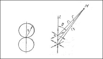Диполь – источник, образованный двумя простыми (сферическими) источниками бесконечно малых размеров с одинаковой производительностью, но работающими в противофазе и находящимися па пренебрежимо малом расстоянии друг от друга (рис. 3.16). Линия I, соединяющая источники, называется осью диполя. Направление этой линии является условным, так как положительный источник, обозначенный значком +, через половину периода станет отрицательным, и наоборот.