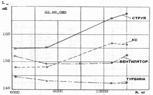 При одинаковой тяге двигателей уровень акустической мощности ТРДД тем выше, чем ниже степень двухконтурности. Максимальные уровни звуковой мощности современных двигателей при взлетном режиме работы достигают величины: у ТРДД с низкой степенью двухконтурности - 170 дБ (НК86, m=1.3), у ТРДД с высокой степенью двухконтурности – 155 дБ (Д18Т, m=6). Для ТРДД со степенью двухконтурности m ≤ 1.5 зависимость уровня акустической мощности от тяги близка к линейной.