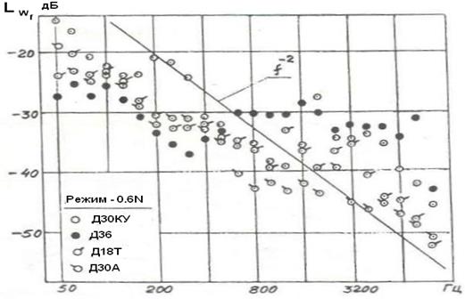 Уровни акустической мощности отечественных турбореактивных двигателей с различной степенью двухконтурности представлены на рисунке 4.16.
