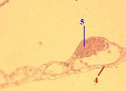 | 1. На этом препарате (с которым мы уже встречались в п. 6.2.2.1) видны первичные сосуды (1). 2. Они располагаются между висцеральным листком спланхнотома (2) и энтодермой (3). 3. В первичных кровеносных сосудах видны эндотелий (4) и клетки крови (5). |