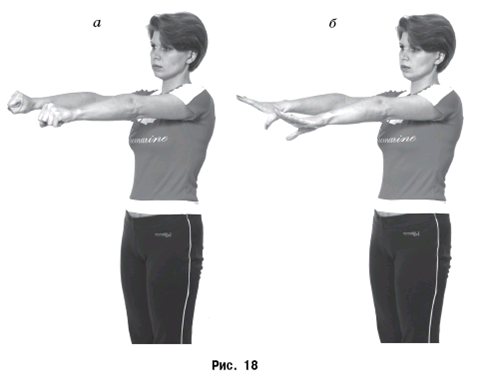 Упражнение 1. Руки вытянуты вперед на уровне плеч. Сжимаем и разжимаем кулаки (рис. 18). Выполняется 8-10 раз.