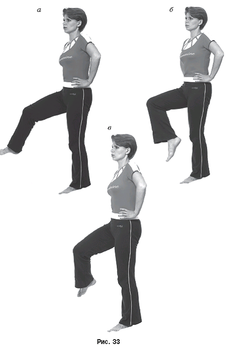 Упражнение 23. Исходное положение – ноги вместе руки, на поясе. Поднимаем согнутую в колене правую ногу, бедро параллельно полу, корпус неподвижный (рис. 37, а). Отводим бедро до отказа вправо и делаем 2 пружинящих движения, стараясь отвести бедро еще дальше (рис. 37, б). Повторяем 8-10 раз, затем то же самое проделываем левой ногой.