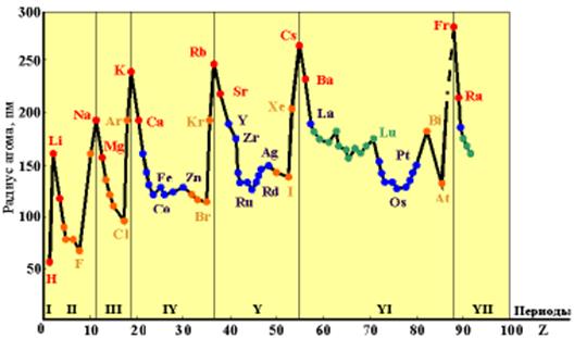 Если рассматривать только относительные величины атомных радиусов, то легко обнаружить периодичность их зависимости от номера элемента.