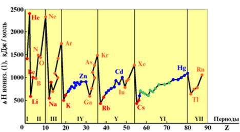 Энергия ионизации изменяется периодически по мере заполнения электронами оболочек атомов (рисунок