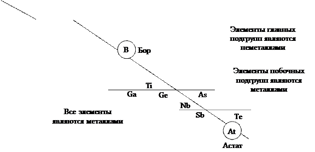 ), то слева от этой диагонали все элементы являются металлами, а справа от неё элементы побочных подгрупп – металлы, а элементы главных подгрупп – неметаллы. Элементы расположенные вблизи диагонали (например,