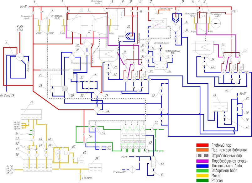 1. турбопривод питательного насоса; 2. турбина высокого давления (ТВД); 3. турбина низкого давления (ТНД); 4. автономный турбогенератор (АТГ); 5. вспомогательная котельная установка; 6. ходовой клапан турбопривода питательного насоса; 7. ходовой клапан ТВД; 8. регулятор системы укупорки концевых уплотнений главной турбины; 9. редуктор; 10. гребной винт; 11. клапан травления; 12. ПГНД; 13. ДУУ стояночного конденсатора; 14. ходовой клапан АТГ; 15. регулятор системы укупорки концевых уплотнений АТГ; 16. стояночный конденсатор; 17. сепаратор пара; 18. дренажный насос; 19. подогреватель питательной воды I; 20. ДУУ главного конденсатора; 21. главный конденсатор (ГК); 22. конденсатный насос ГК; 23. деаэратор; 24. турбопитательный насос; 25. резервный питательный насос; 26. фильтр ионообменный; 27. цистерна горячих конденсатов; 28. дренажный насос; 29. подогреватель питательной воды II; 30. ВЭЖ главной турбины; 31. ГЭЖ главной турбины; 32. подогреватель питательной воды ПГНД; 33. фильтр тонкой очистки питательной воды; 34. питательный насос ПГНД; 35. подогреватель питательной воды III; 36. теплый ящик ПГНД; 37. конденсатоотводчик; 38. конденсатный насос стояночного конденсатора; 39. конденсатор АТГ; 40. конденсатный насос АТГ; 41. ГЭЖ АТГ; 42. ВЭЖ АТГ; 43. воздухоотделитель; 44. подогреватель питательной воды IV; 45. фильтр тонкой очистки питательной воды; 46. теплый ящик; 47. аварийный питательный насос; 48. дроссельный клапан; 49. байпасный клапан; 50. питательный клапан; 51. насос забортной воды ВОУ; 52. насос откачки рассола ВОУ; 53. сборник дистиллята; 54. насос откачки дистиллята; 55. конденсаторы отработавшего пара; 56. подогреватель забортной воды; 57. напорная масляная цистерна; 58. сточно-циркуляционная цистерна; 59. цистерна судового запаса масла; 60. цистерна грязного масла; 61. фильтр масляный низкого давления; 62. главный масляный насос; 63. фильтр масляный высокого давления; 64. маслоохладитель; 65. аварийный масляный насос; 66; масляный фильтр низкого давления; 67. сепаратор масла; 68. маслоподогреватель; 69. маслоперекачивающий насос.