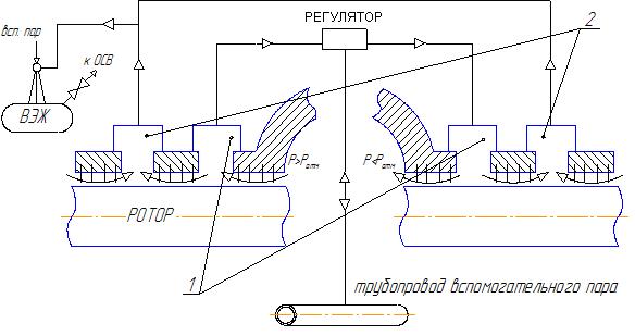 Из носовой камеры укупорки пар по паропроводу подаётся в кормовую камеру укупорки 1, чтобы поддерживать там давление выше атмосферного, препятствуя тем самым подсосу воздуха из отсека в проточную часть турбины. Указанный паропровод имеет связь с системой вспомогательного пара для обмена средой (сброса/приёма пара). Из кормовой камеры укупорки пар через уплотнения попадет в проточную часть турбины и в кормовую камеру отсоса 2, в которую также подсасывается воздух из отсека. Из кормовой камеры отсоса 2 смесь пара и воздуха удаляется вспомогательным эжектором.