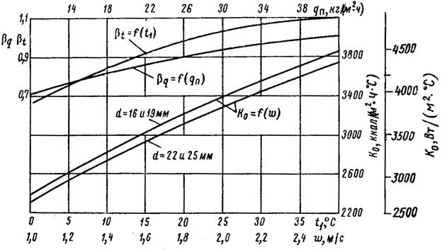 - п.13 - Наружный диаметр трубок dнар, п.16 - коэффициент теплоотдачи К0, п.19 - коэффициент, учитывающий температуру забортной воды bt, п.20 - удельная паровая нагрузка поверхности охлаждения qп, п.21 - коэффициент, учитывающий паровую нагрузку bq определить по номограмме рис.22 ([1], стр.38).