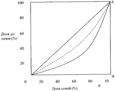 Если мы разделим все население страны на 5 частей (квинтилей), т.е. по 20%, и совокупные доходы общества также по 20%, и предположим, что 20%, 40%, 60% семей получают соответственно 20%, 40%, 60% от всего дохода, то соответствующие точки будут располагаться на биссектрисе, которая называется линией абсолютного равенства. В данном случае речь идет о теоретической возможности равного распределения доходов, когда любой данный процент семей получает соответствующий процент дохода. Кривая Лоренца показывает, как фактически распределены доходы (сплошная линия). Например, 20% населения с самыми низкими доходами получили 5% общего дохода, 40% с низкими доходами - 15% и т.д. Область между линией абсолютного равенства и кривой Лоренца показывает степень неравенства доходов: чем она больше отклоняется от биссектрисы, тем больше неравенство в распределении доходов. Также па рис. 3 мы можем увидеть и линию абсолютного неравенства, идущую под прямым углом (0BA). Сплошная линия кривой Лоренца показывает распределение личных доходов до вычета налогов и получения различных социальных выплат. Но после уплаты налогов и получения выплат мы можем построить новую кривую Лоренца -кривую для располагаемого дохода (на рис. 3 она обозначена пунктиром). Она менее вогнутая, поскольку произошло перераспределение доходов и уменьшилось первоначальное неравенство в их уровне. Таким образом, чем активнее социальная политика государства по сглаживанию дифференциации доходов, тем менее вогнута кривая Лоренца. Отличие кривых Лоренца для личных и располагаемых доходов обусловливается конкретными социальными программами и системами налогообложения, применяемыми в разных странах. Например, в США сглаживание дифференциации в распределении располагаемых доходов достигается не столько налоговой системой, сколько различными выплатами, которые доходят до 75% дохода малообеспеченных слоев населения. В то же время значительная роль налоговой политике отводится в Скандинавских странах.