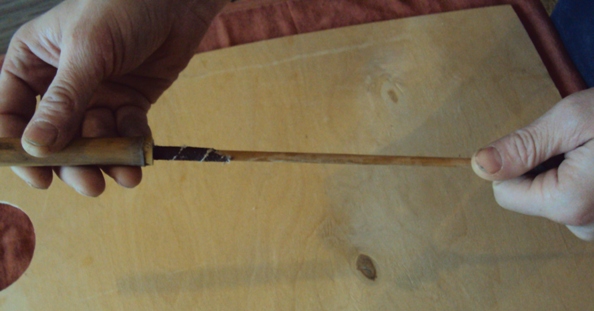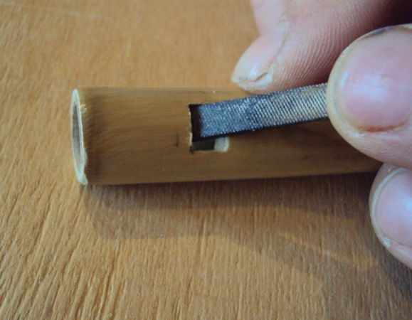 После настройки шести дырочек с верхней поверхности флейты, необходимо зачистить внутренний канал от остатков гари наждачкой: