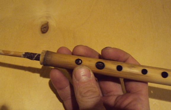 Теперь с помощью тюнера проверяем тональность (первый звук) нашей флейты. У меня получился»Ре». Дальше необходимо прожечь первое отверстие. В начале прожигаем дырочку маленького диаметра,проверяем тюнером и подстраиваем отверстия, расширяя его.Чем шире и выше к свистку отверстие,тем выше нота. Строй свирели диатонический, т.е. гамма мажорная или минорная. При всех закрытых отверстиях получилась нота «Ре», значит первая дырочка будет соответствовать ноте «Ми», вторая ноте «Фа диез», третья-»Соль», четвертая-»Ля», пятая «Си», шестая «До диез», и нижняя «Ре». Это мажор. Ниже выложу схему с промерами отверстий и устройством свистка.