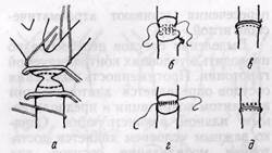 Применяют два вида швов: а) матрацный выворачивающий на заднюю полуокружность аорты (вначале накладывают швы на расстоянии и затягивают после сопоставления) и обвивной или матрацный шов на переднюю стенку; б) обвивной непрерывный шов вначале на заднюю стенку (из просвета аорты), а затем на переднюю. У детей переднюю стенку ушивают отдельными П-образными швами,