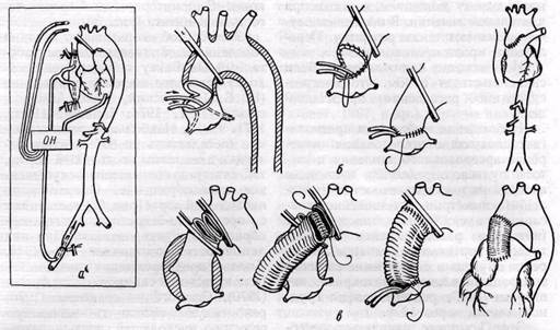 Рис. 36. Методы хирургического лечения расслаивающей аневризмы грудной аорты путем ушивания расслоенных оболочек или сегментарной резекции на месте начального разрыва интимы с реанастомозом или интерпозицией сосудистого протеза с использованием экстракорпорального кровообращения, перфузии сонных и коронарных артерий: а — схема искусственного кровообращения; б — способ лечения при расслаивающей аневризме I типа; в — способ операции при аневризме II типа (по De Bakey с соавт., 1965)