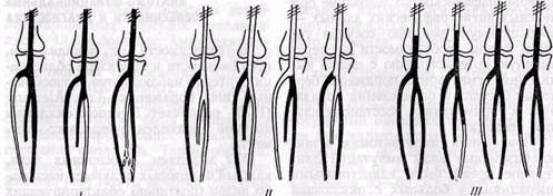 Мы выделяем 3 основных типа, каждый из которых включает несколько видов (подтипов) облитерирующих поражений подколенной и берцовых артерий (рис. 111, 112): I тип: полная облитерация дистальной части (трифуркации) подколенной артерии и начальных отделов берцовых артерий — сохранена проходимость 1, 2 или даже 3 артерий в средней и дистальной третях голени; II тип: облитерация 1 или 2 артерий голени — сохранена проходимость дистальной части подколенной и 1 или 2 берцовых артерий; III тип: облитерация берцовых артерий и подколенной артерии — может быть сохранена проходимость отдельных сегментов артерий на голени или стопе.