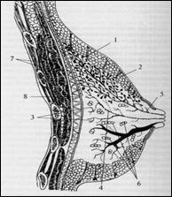 Молочные железы – парный орган, имеющий трубчатоальвеолярное строение и располагающийся на передней поверхности грудной клетки. Состоит из паренхимы – железистой ткани с проходящими в ней протоками различного калибра; стромы – соединительной ткани, разделяющей железы на доли и дольки; жировой ткани, в которою погружены паренхима и строма железы (рис. 1)